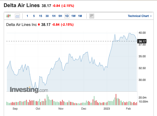 다음으로 델타항공입니다. 델타항공의 4분기 실적발표는 1월에 있었습니다. 매출은 17%가 증가한 134억달러를 기록하며 앞서 설명드린 보잉과 같이 좋은 결과를 보여줬습니다. 덕분에 2022년 하반기 대비 큰 폭의 주가 상승을 보여주기도 했죠. 델타항공 역시 크게 뛴 주가로 인한 수익실현 및 조정의 구간을 거치고 있는 것으로 보여집니다. 보잉에 비해 상대적으로 조정의 폭이 컸는지 주가는 위 아래로 크게 요동치다가 38.17달러를 지키고 있습니다.