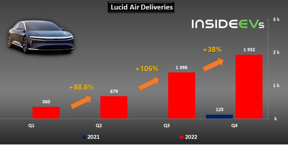 루시드에어의 인도량을 살펴보면, 22년도에 총 4369대를 인도했습니다.