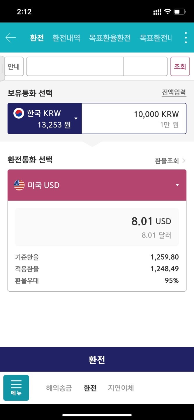 기준 환율과 적용 환율이 다르게 나와있습니다만, 이는 환율 우대 덕분에 그렇습니다.