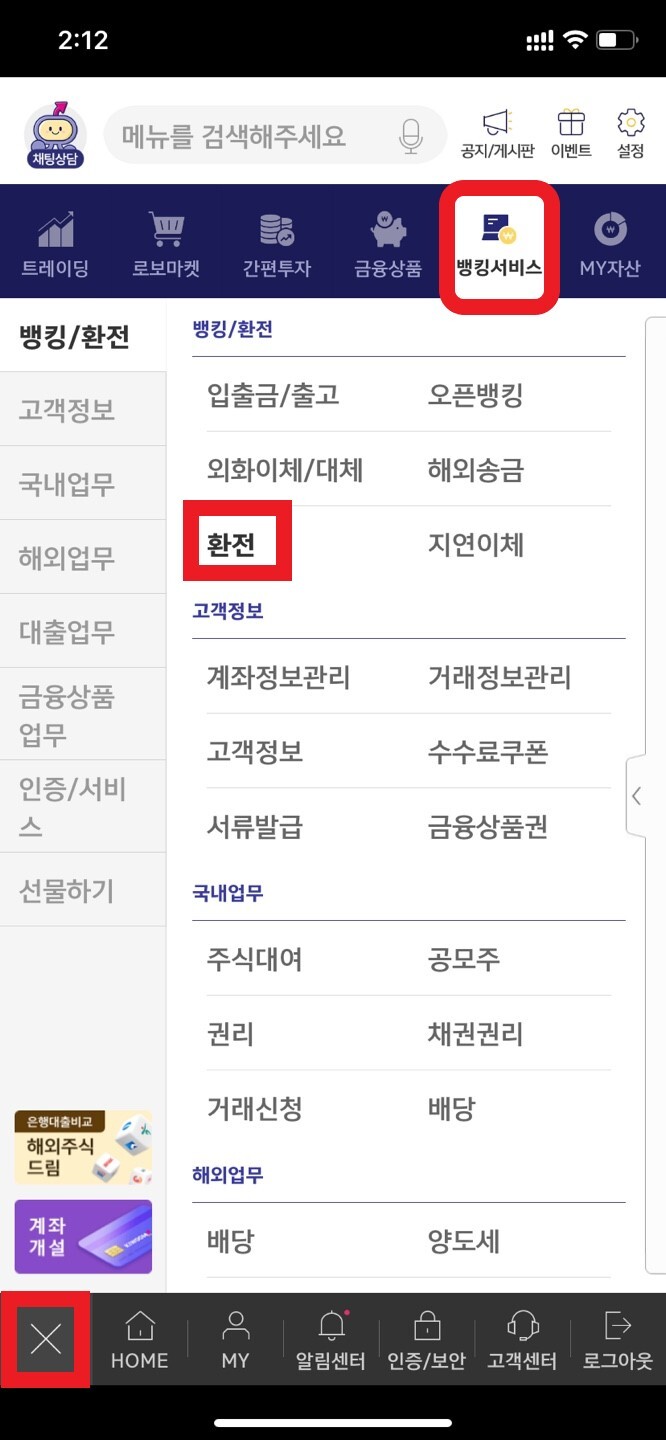 키움증권 어플에 접속하셔서 우측 하단의 메뉴를 터치하시고, 우측 상단의 뱅킹 서비스 -> 환전 순서대로 터치해주시면 되겠습니다.