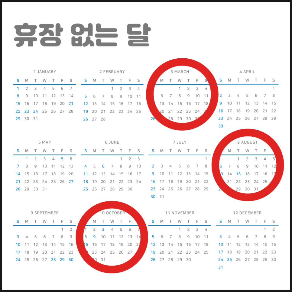 미국주식 휴장일이 없는 달은 3,8,10월달입니다. 참고로 TMI 하자면 우리나라 휴장일이 미장보다 하루 더 많습니다.