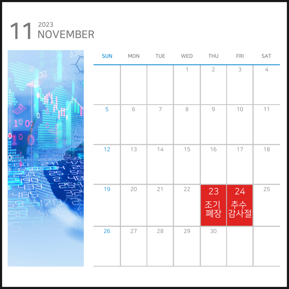 마지막 4분기 11월의 미국주식 휴장일은 넷째주 금요일인 추수감사절 날입니다. 단! 전 날인 23일날 7월달처럼 조기폐장(우리나라 새벽 3시)되오니 꼭 참고하세요.