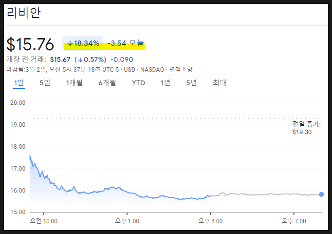 미국의 EV스타트업인 리비안 주가가 실적 발표 후 무려 18.34% 나 하락했습니다.