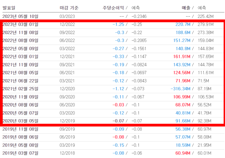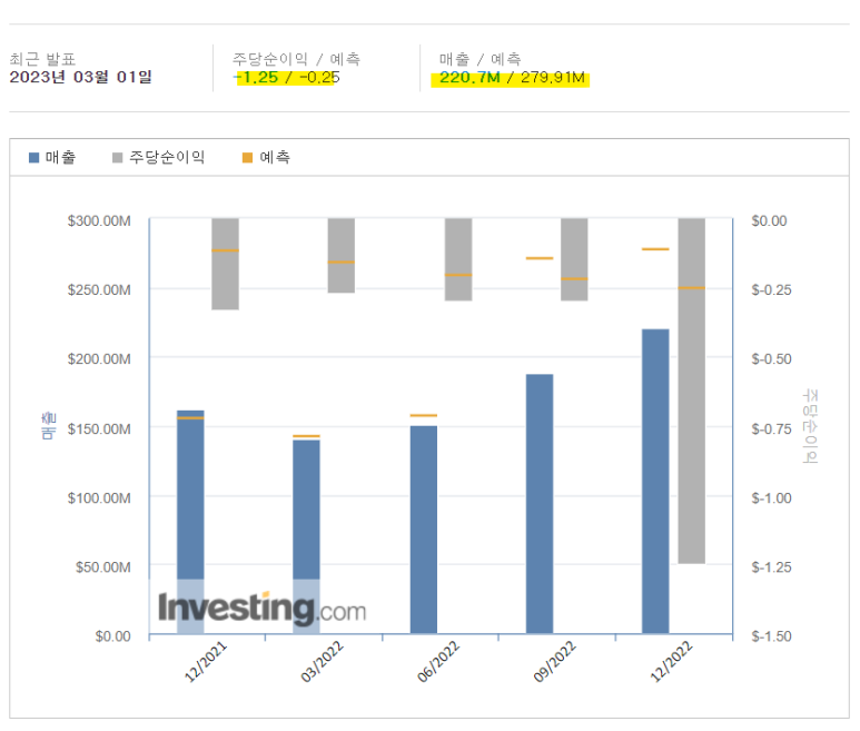 분기 주당순이익(EPS)은 -1.25달러로 전년 동기 대비 52.44% 감소했으며 시장전망치 -0.25달러에 비하면 약 400%이상 하회한 것으로 어닝쇼크 수준이다.