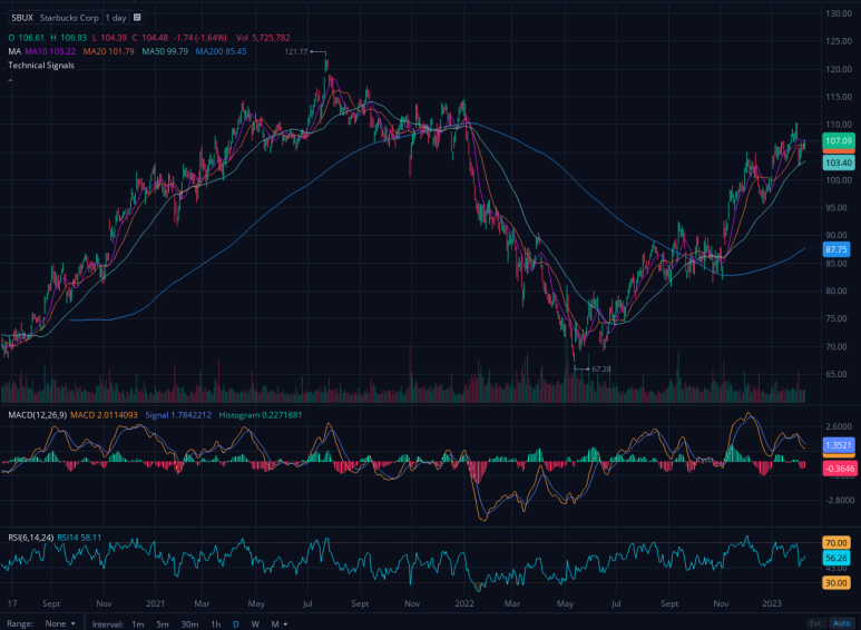저는 현재 스타벅스 주식을 담아야 할 시기인지 차트가 보여준다고 생각합니다. 22년 주가는 67달러까지 빠진 다음 벌써 100달러대까지 회복했습니다.