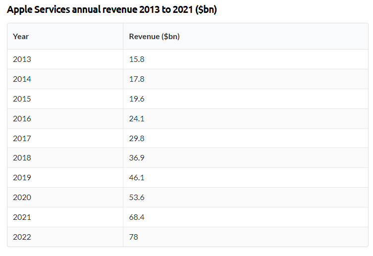 이 서비스부분에는 애플티비,뮤직,피트니스,뉴스,아이클라우드 등과 같은 서비스의 구독 수입이 포함되어 있으며 2022년 서비스 매출은 전년 대비 14% 증가한 78억 달러로, 아이폰 성장률의 두 배입니다.
