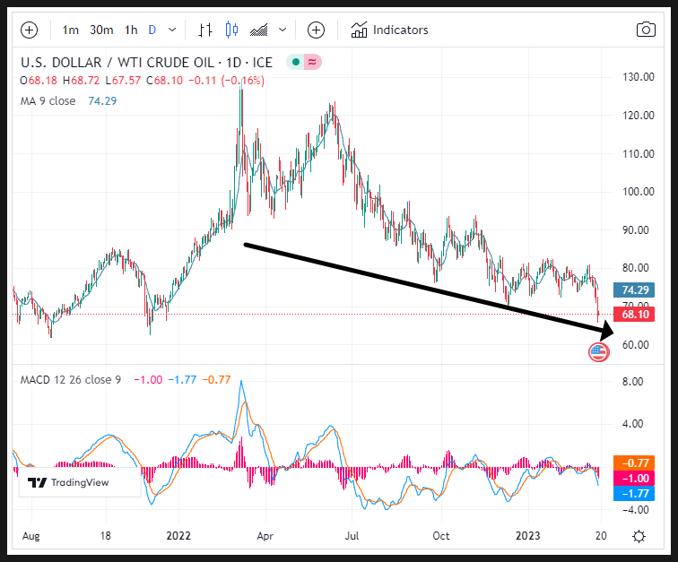 WTI 가격이 70달러를 하회한 것은 지난 2022년 이후 처음입니다. 현재 차트로 봐도 고점을 찍고 하락세를 보이고 있는 추세임을 알 수 있습니다.