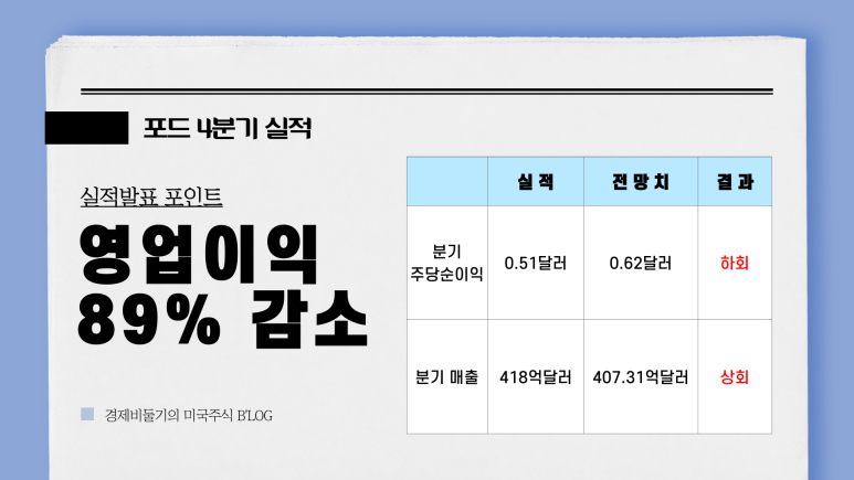 4분기 포드의 실적을 간단하게 요약하자면 분기 주당순이익은 0.51달러로 시장 전망치 0.62달러보다 18.05% 하회해 어닝 쇼크를 기록하였습니다.