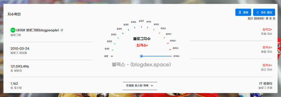 궁금했던 네이버 공식 블로그팀의 블로그 지수입니다. 종합 지수 최적 4+ 이네요 ㅎㅎ