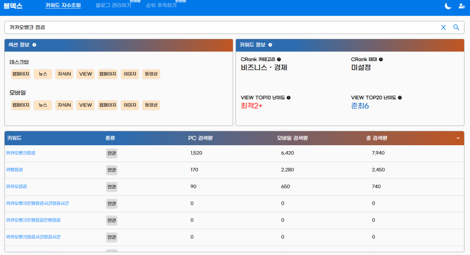 보통 다른 서비스에서는 이러한 키워드 분석은 유로로 제공하는데 블덱스는 이 기능도 무료로 이용 가능합니다.