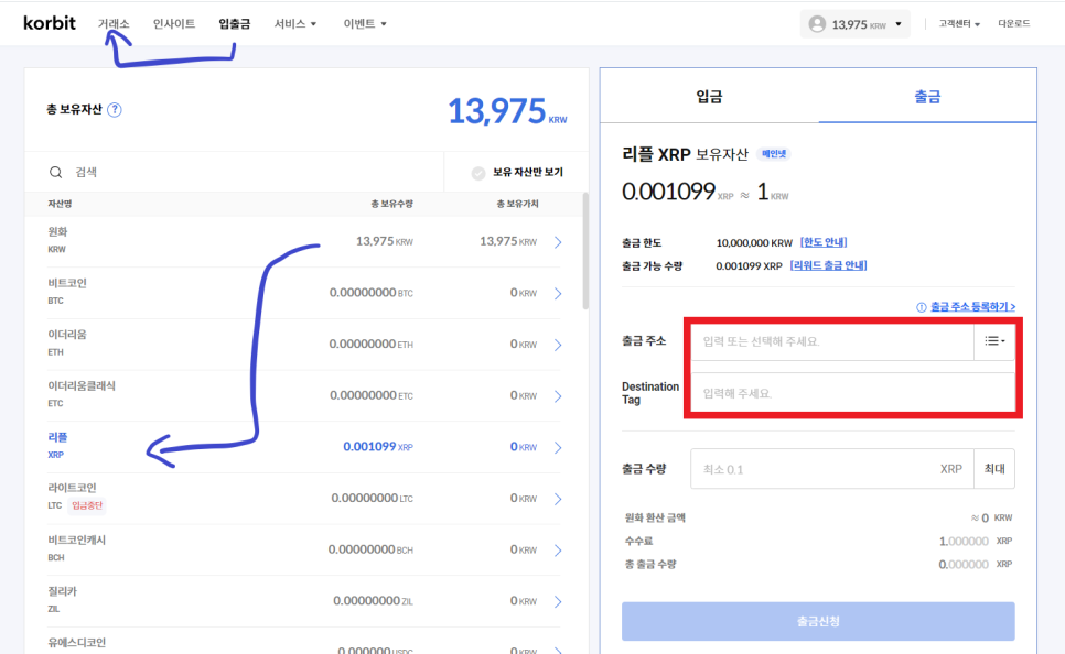거래 기능을 통해 리플을 매수해주시고 이후 출금을 하면 되겠죠.