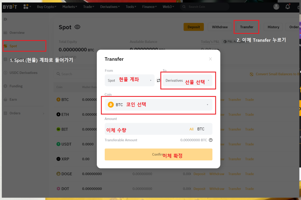 Spot(현물계좌)에서 Derivatives (파생/선물) 계좌로 세팅을하고 코인을 선택한다음 수량을 설정해서 이체를 눌러줍니다. 보통 USDT를 많이들 쓰시고 BTC로도 하시는 분들도 많고요. 선택입니다.