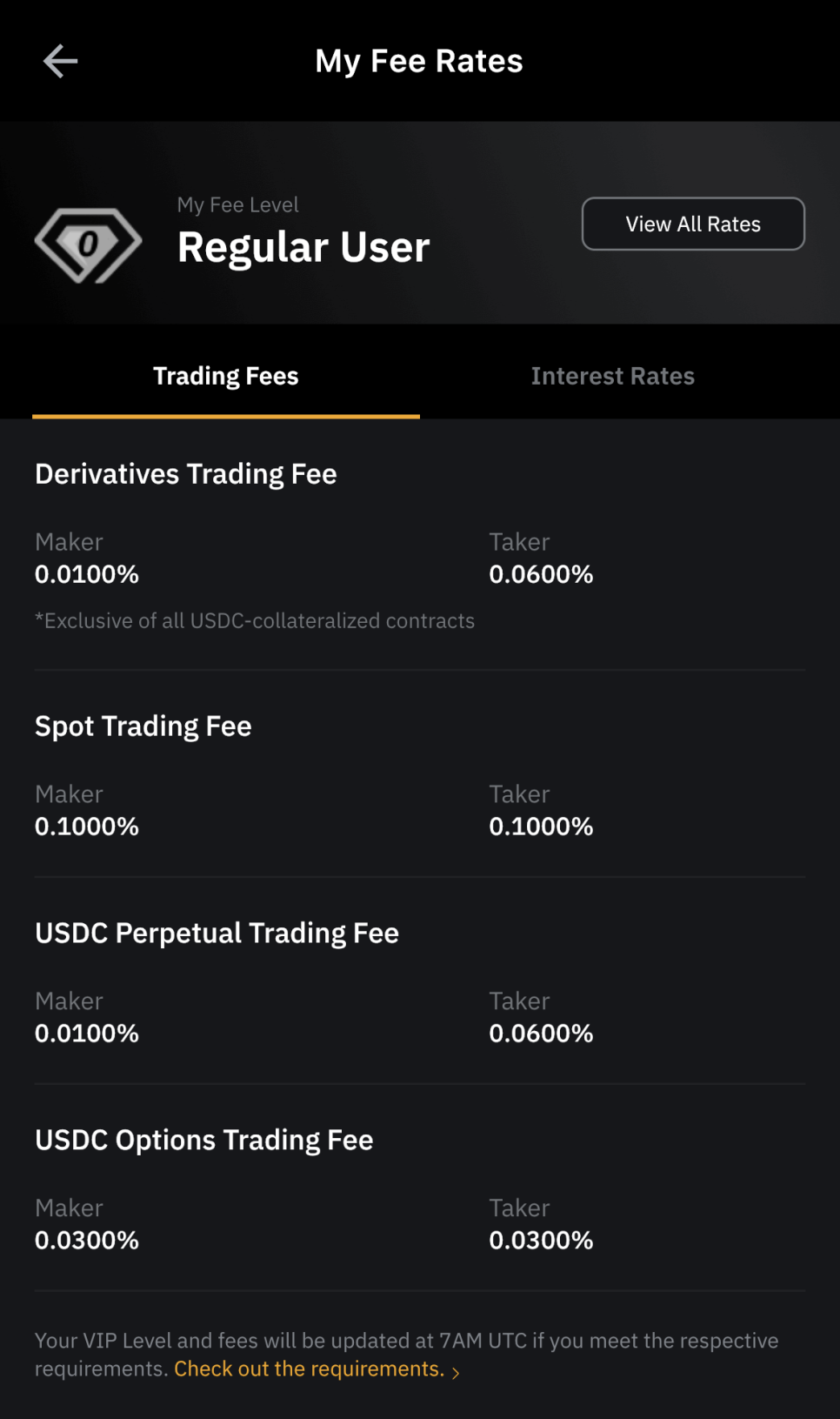 마지막으로 훑어볼 것이 바로 지금까지 소개한 바이비트를 통해 코인 현물이나 파생상품 거래를 진행할 때 적용되는 수수료를 확인해보겠습니다. 추천인 코드를 입력하지 않고 기본 회원가입을 완료하는 모든 회원들에게 적용되는 거래 수수료는 다음과 같습니다.