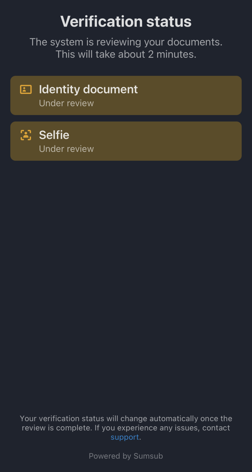 사진 두 번 촬영하는 것으로 아주아주 간편하게 KYC 인증 신청이 완료되었고, 1분도 채 되지 않은 시간이 흐른 뒤 In Progress (진행 중) 이었던 인증 상태 값이 Verified (인증 완료)로 변경된 것 또한 금방 확인할 수 있었습니다. 이런 시스템들이 예상했던 것보다 잘 갖추진 거래소가 아닌가 하는 생각도 동시에 해봤습니다.