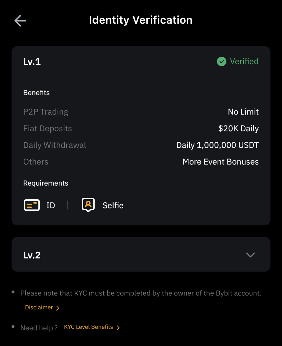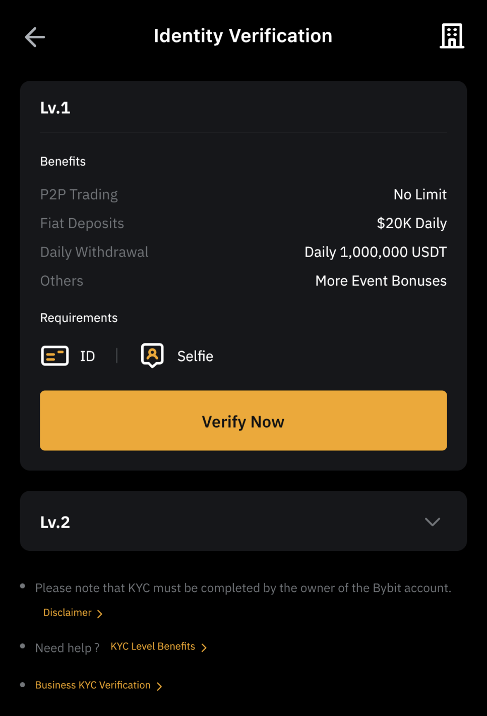 가장 첫 번째 KYC인증 절차를 진행해보겠습니다. 이 인증 절차가 완료되면 이용할 수 있게 되는 서비스의 스케일 또한 인증 화면에서 확인하실 수 있습니다. 바이비트를 이용해 규모가 큰 투자를 진행하실 분들은 자신이 보유한 투자금의 스케일에 맞춰 인증 레벨을 맞춰주시면 됩니다.