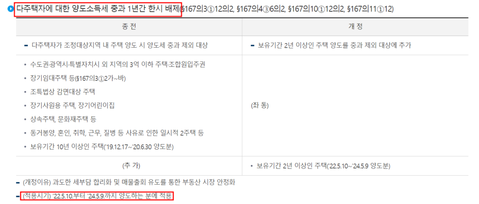 또한 1세대 2주택, 3주택 이상, 즉 '다주택자'들은 23월 5월 9일까지만 한시적으로 기본세율이 적용됩니다.