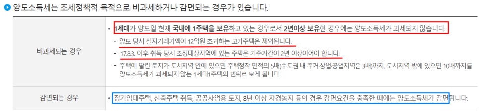 -1세대가 양도일 현재 국내에 1주택을 보유하고, 2년 이상 보유한 경우 양도 소득세가 과세되지 않습니다.