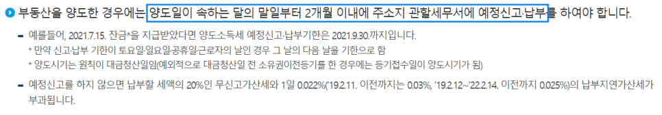 부동산을 양도할 경우 양도일 당일이 속하는 달의 말일부터 2개월 이내에 주소지 관할세무서에 예정신고와 납부를 해야합니다.