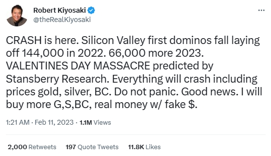 이날 로버트 기요사키는 시장 붕괴 신호가 지난해 빅테크 기업들의 감원 조치에서부터 나타나기 시작했다고 설명했다. 그는 "지난해 기술 산업 종사자 가운데 14만 4,000명이 일자리를 잃었다며 올해는 6만 6,000명이 해고 명단에 추가됐다"고 전했다.