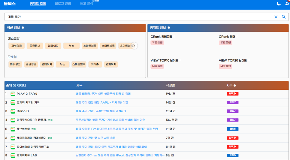 실제로 보시면 애플 주가를 주제로 적은 블로거들의 지수는 하나같이 높습니다.