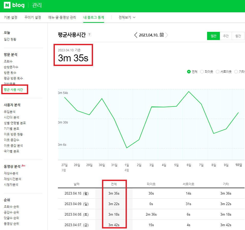 체류시간은 통계 -> 평균 사용 시간에서 확인 가능!