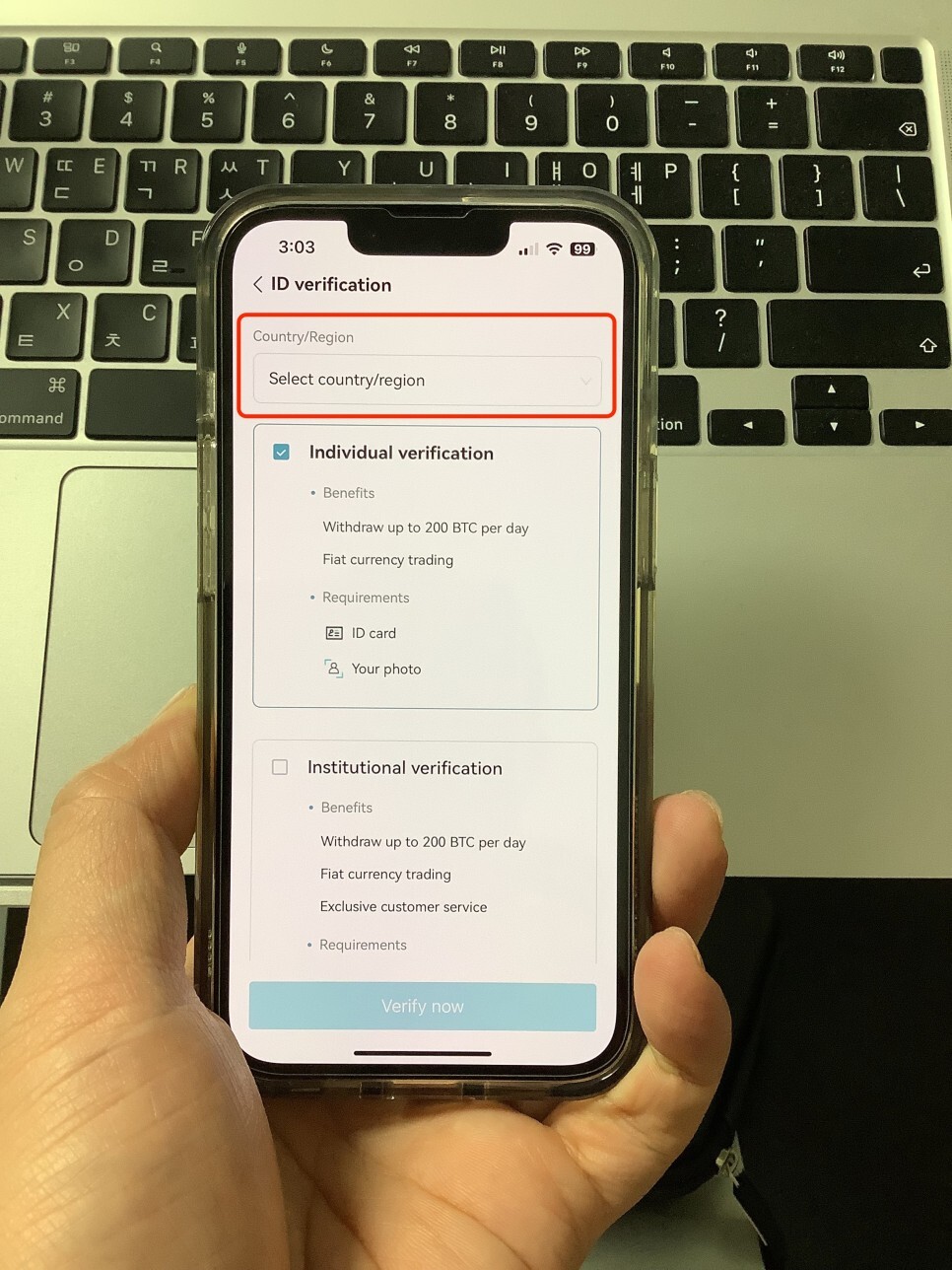 KYC인증을 시작하기 위해 첫 화면 중앙에 [ID Verification]이라는 메뉴를 선택해주시면 됩니다.