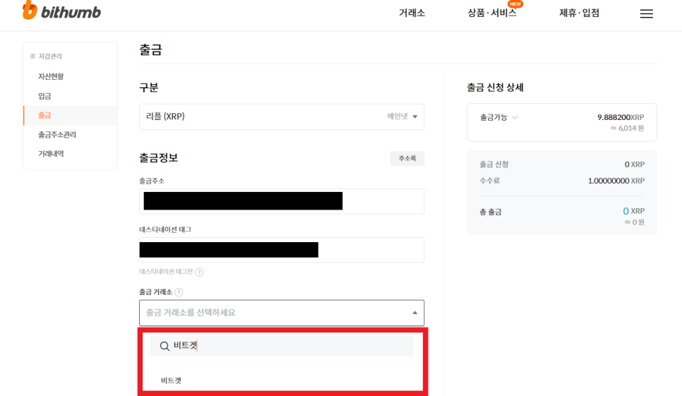 이후 출금 주소와 데스티네이션 태그를 복붙해주시고 출금 거래소를 비트겟으로 설정해주시면 됩니다.