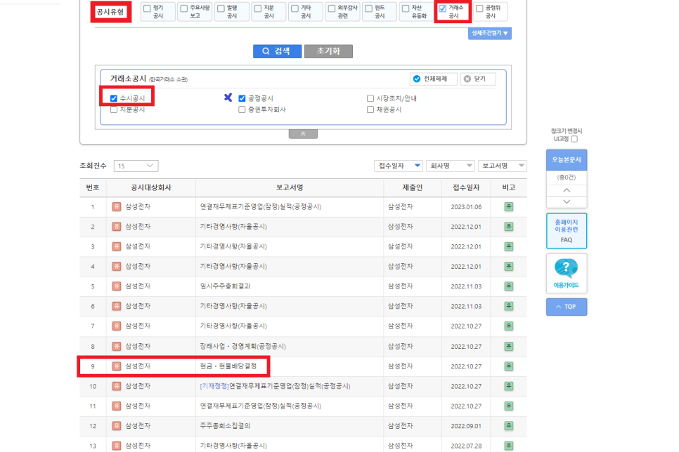 삼성전자를 검색하시고 아래로 살짝 내리시면 공시 유형 항목이 있습니다.