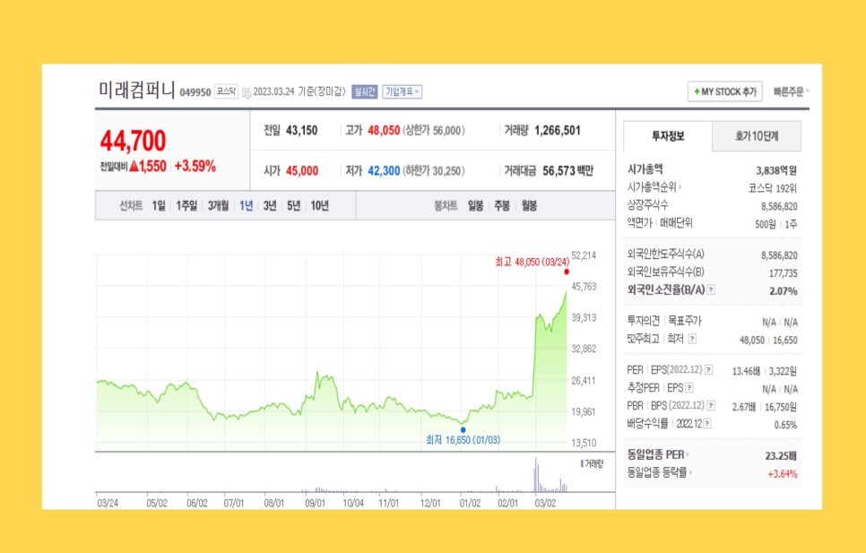 최근 미래컴퍼니 주가가 저점대비 3배 가량 오른 것을 확인할 수 있습니다.