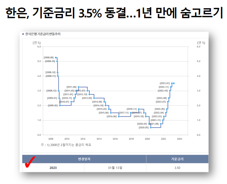 가장 최근인 2월 금통위에서 3.5%로 동결하였습니다.