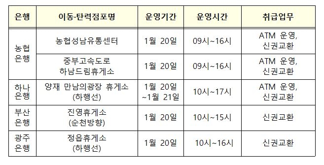 설 연휴 중 은행 방문이 꼭 필요한 경우도 있죠. 세뱃돈을 위한 신권준비를 미처 하지 못했거나 환전이 필요한 경우, 시중은행들이 운영하는 이동점포와 탄력점포를 이용할 수 있습니다. NH농협은행은 성남유통센터와 중부고속도로 하남드림휴게소에서 20일 이동점포를 운영해 ATM과 신권교환 서비스를 제공합니다.