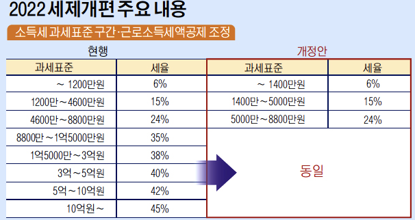 이제 소득금액에서 소득공제를 빼면 과세표준이 됩니다. 이 과세표준으로 세율을 곱하면 산출 세액이 나옵니다. 여기서 중요한 것은 세율입니다. 즉 얼만큼 세율을 매기냐에 따라 산출세액이 달라집니다. 2022년도 세율에 대해 알아보겠습니다. 올해 윤정부가 출범하면서 과세 체계를 15년 만에 개편했습니다. 아래는 2022년 세율에 대한 변경 대비 표입니다. 표에서 볼 수 있듯이, 소득세 최저세율인 6%가 적용되는 과세표준 구간을 ‘1200만원 이하’에서 ‘1400만원 이하’로 확대했습니다. 이 뿐만아니라 8800만원 까지 소득 기준을 올려서, 세제 부담을 완화하도록 개편되었습니다. 그러나 8800만 이상의 소득에 대해서는 기존과 동일한 세율이 매겨집니다.