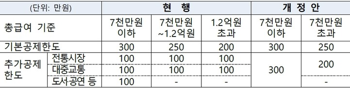 도서·공연 등 사용분에 30% 소득공제를 적용하는 것에는 ‘영화관람료’를 추가했습니다. 공제한도도 기존 3구간에서 2구간으로 단순화 되었습니다. 이번에 개정된 개정안은 2025년 말까지 적용된다고 합니다. 신용카드 사용금액 중에서 소득공제 대상이 아닌 것도 있습니. 신차 구입비용(중고자동차 구입금액의 10%는 공제 대상), 통신비, 세금과 공과금, 아파트관리비, 자동차리스료, 해외에서 결제한 금액, 현금서비스 등은 신용카드 소득공제 대상에서 제외됩니다다.