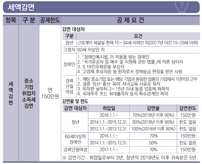 예를 들어, 수도권에 있는 건설업을 영위하는 소기업이라면 중소기업특별세액감면이 적용되는데, 산출세액의 20%가 감면됩니다. 여기서 중요한 것은 산출세액을 기준으로 하고 있는 것이 핵심입니다. 즉 위 식에서 산출세액 자체를 줄여주는 것입니다. 대표적인 세액감면으로는 중소기업특별세액감면이나 창업중소기업 세액감면, 지방이전기업 임시특별세액감면 등이 있습니다. 아래는 세액감면의 대상 표입니다.
