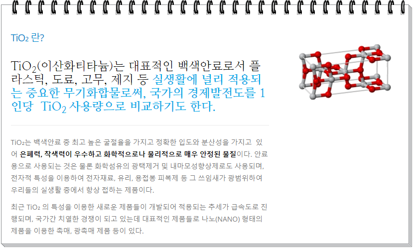 코스모화학는 주로 이산화티타늄을 제조를 하는 회사로 종속기업으로는 기능성필름, 2차전지용양극활물질 등을 생산 및 판매하는 코스모신소재와 유기 및 무기 화학공업 제품제조, 시스템 인터그레이션서비스업을 영위하는 코스모촉매 및 코스모에코켐이 있으며 국내 유일의 이산화티타늄 제조업체로 수입제품 외 국내 경쟁 생산업체는 없다고 봐도 무방합니다.