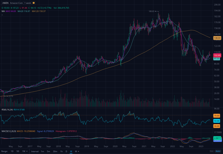 아마존 주가는 80달러대 까지 떨어진 후 현재 반등을 보이면서 100달러대를 회복한 상황입니다. 하지만 고점대비 여전히 주가는 많이 하락한 상황 속에서 팬데믹기간 동안의 성장세를 뒤로 하고 현재는 주가 반등을 이어갈 수 있는 소재가 있는지 의문입니다.