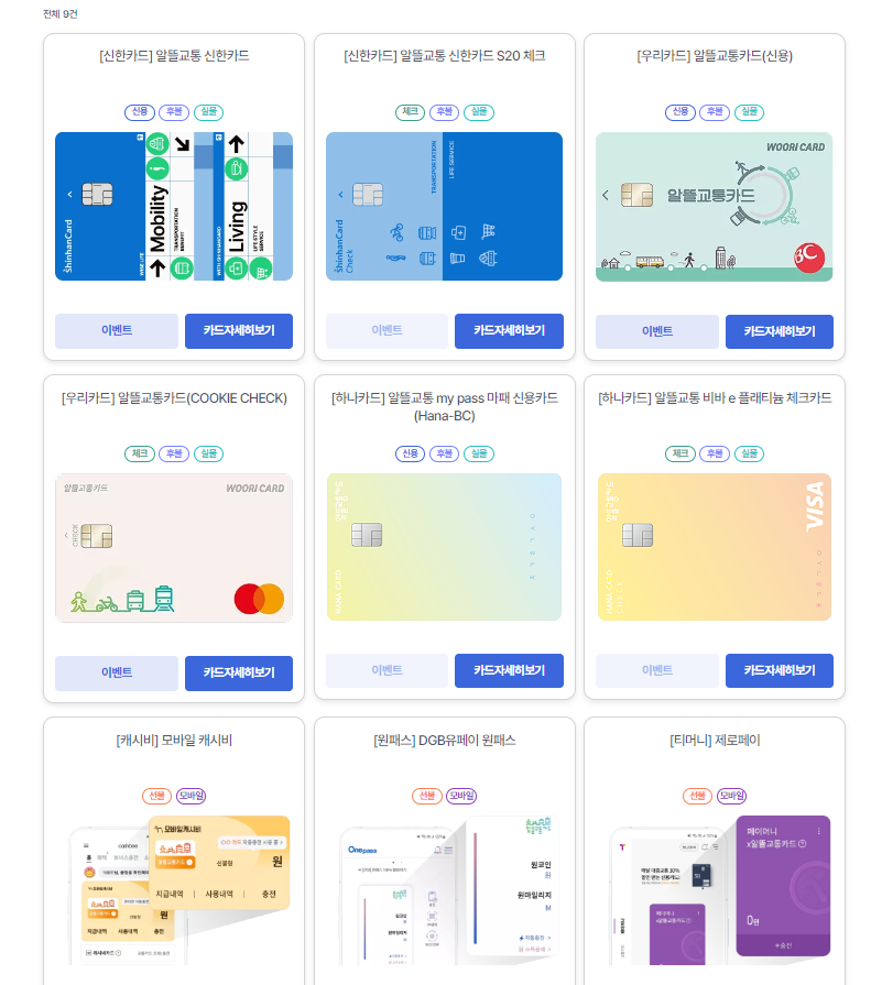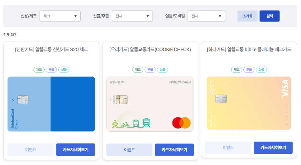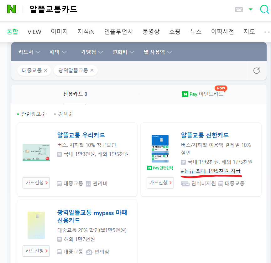 알뜰교통카드를 검색하면 이렇게 신용카드 3가지가 나옵니다.