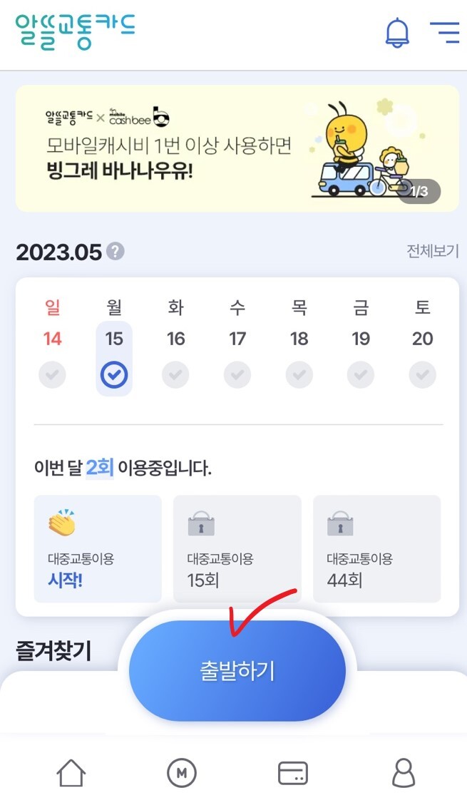 알뜰교통카드 어플을 사용하기 위해서는 출발하기 버튼을 누르면 됩니다.