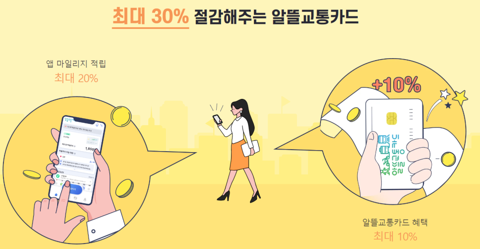 알뜰교통카드로 매달 최대 30%의 교통비를 절감할 수 있습니다.