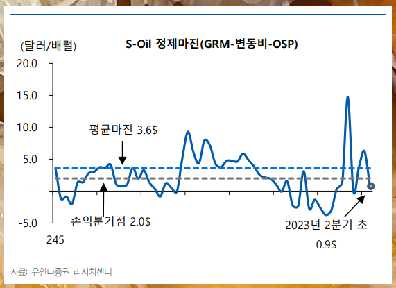 손익분기점보다 낮은 정제마진을 23년 2분기 초에