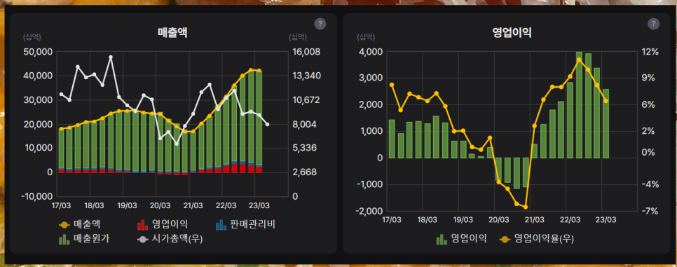 실적을 봅니다. 매출은 역대급을찍고