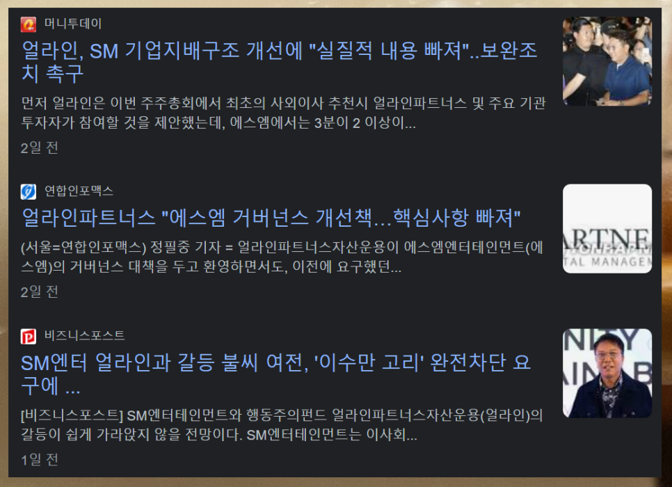 그럼 왜 주가가 선방을 했느냐… 라면 에스엠의 고질적인 문제점인 대주주 이슈가 있습니다. 수만이 형님이 ‘라이크기획’이나 여타 자잘한 회사들을 만들어서 그 동안 영업이익을 그 회사로 몰아주기를 했는데요. 글로벌 스탠다드 관점에서는 배임행위이고, 이에 대해서 요새 은행주에게도 압력을 넣고 있는 ‘얼라인파트너스’라는 행동주의펀드가 압박을 가했습니다.