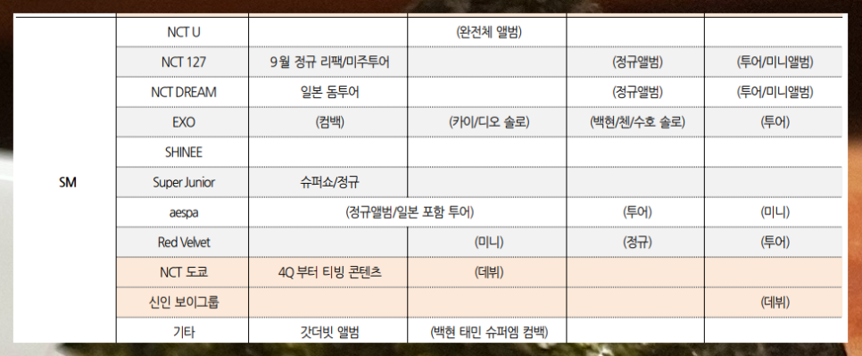 위와 같이 라인업 표를 보면. 정말로 돈을 벌 수 있는 친구들이 NCT 친구들 밖에 없다는 생각이 듭니다. 나머지는 노쇠했거나 걸그룹은 애스파를 빼고는 그닥. 그리고 애스파도 요새 퍼포먼스가 별로 좋지 않쥬.