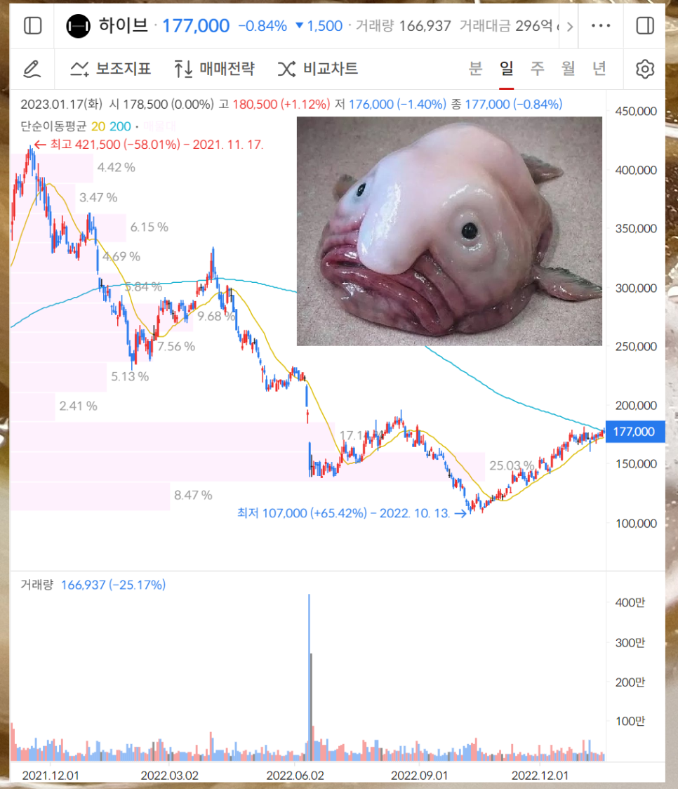 하이브의 경우는 비싼 상장가격에 대한 대가를 혹독하게 치루고 있습니다. 10만원까지 갔다가 현재는 그래도 꽤나 빠른 반등을 해서 17만원대에서 거래되고 있습니다.
