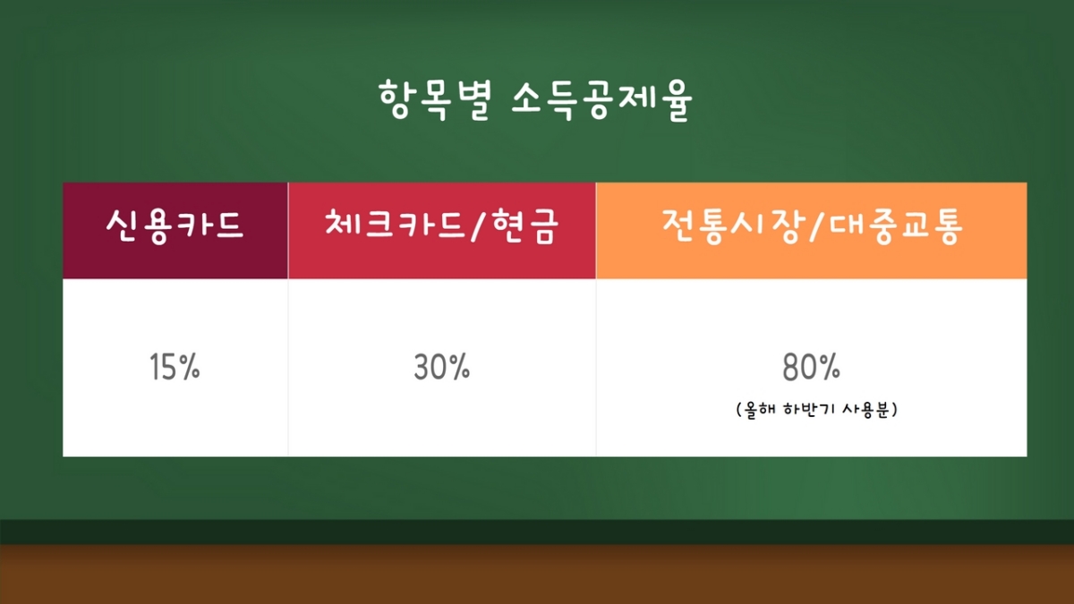 만약 이미 신용카드 사용액이 25%를 넘은 경우라면 어떨까. 이 때부터는 체크카드나 현금을 쓰는 것이 더 이득이다. 소득공제율이 신용카드의 경우 15%이지만 체크카드와 현금영수증은 30%이기 때문이다. 물론 전통시장 장보기도 공제율을 높이는 방법이다. 정부는 한시적으로 올해 하반기분(7월~12월) 전통시장 사용금액에 대해서는 공제율을 기존 40%에서 80%로 상향 적용하기로 했다. 또 정부가 고유가 대책으로 대중교통 공제율 역시 올해 하반기 분에 한해 80%로 올린 만큼 연말까지 남은 기간동안 버스·지하철을 자주 타면 공제혜택이 늘어난다.