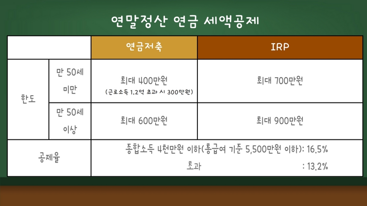 연금저축과 개인형퇴직연금(IRP)에 저축한 금액은 세액공제 대상이다. 소득공제가 과세대상 금액을 줄여주는 것이라면, 세액공제는 세금 자체를 줄여주는 방식이다. 연금저축과 IRP를 합쳐 연금계좌라고 하는데, 연금계좌에는 한 해 1800만 원을 저축할 수 있다.