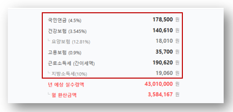 월환산 실수령액은 대략 358만원이네요!