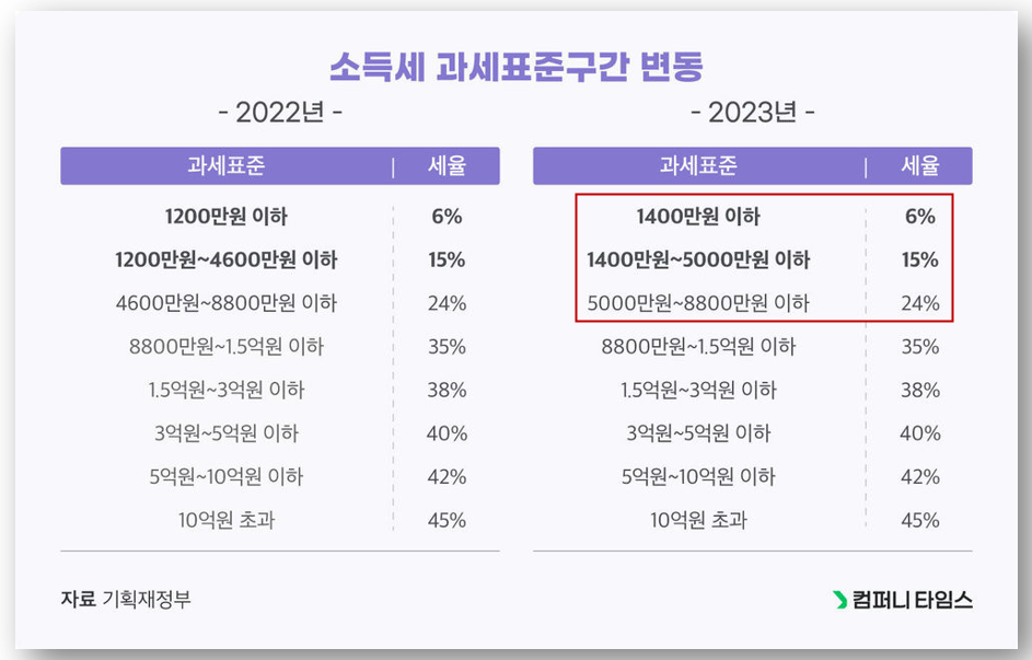 6% 세율이 적용되는 소득세 과세표준이 1천200만에서 1천400만원으로 상향되었습니다.