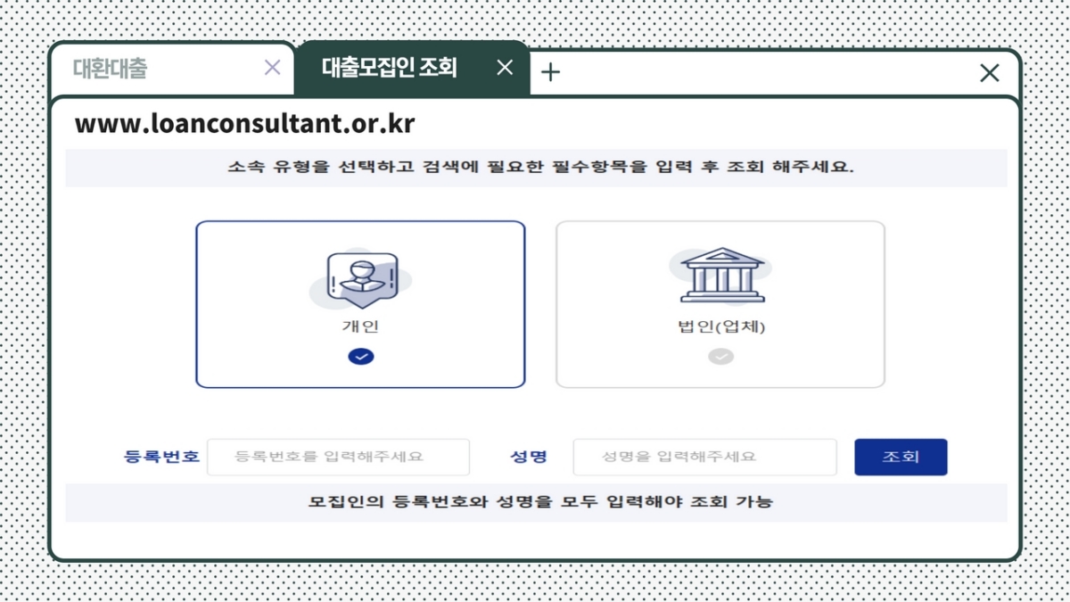 피해를 방지하려면 사전에 은행연합회가 운영하는 대출모집인 통합조회시스템에서 모집인 등록정보를 확인하는 것이 좋다. www.loanconsultant.or.kr에서 등록번호와 성명만 입력하면 바로 조회가 가능하다.