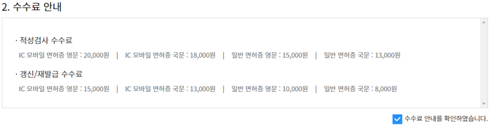 재발급 과정 도중에 수수료에 대한 사항은 다음과 같이 갱신을 포함하여 안내되는데요.